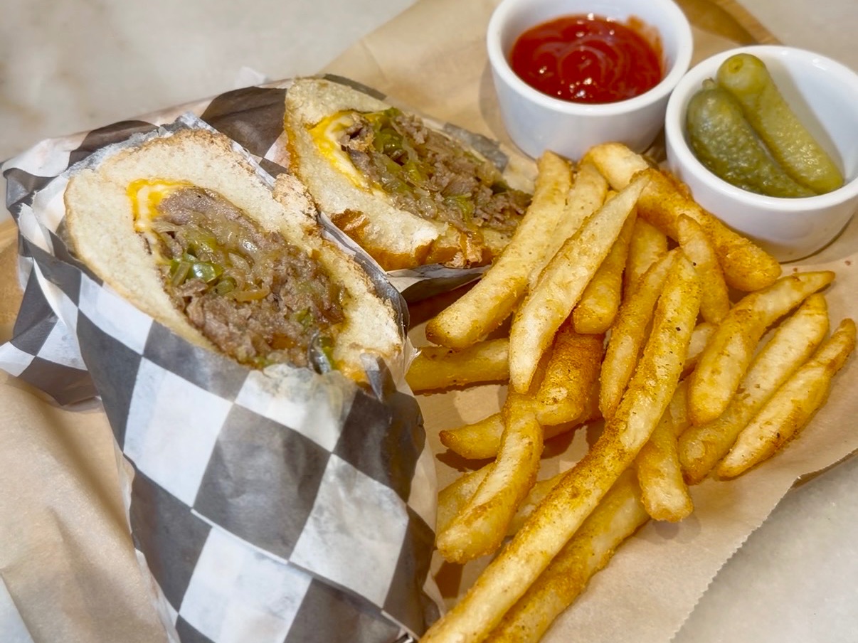 Tender steak strips cooked to perfection, layered with gooey cheese in a warm roll, paired with golden fries and a fresh pickle.