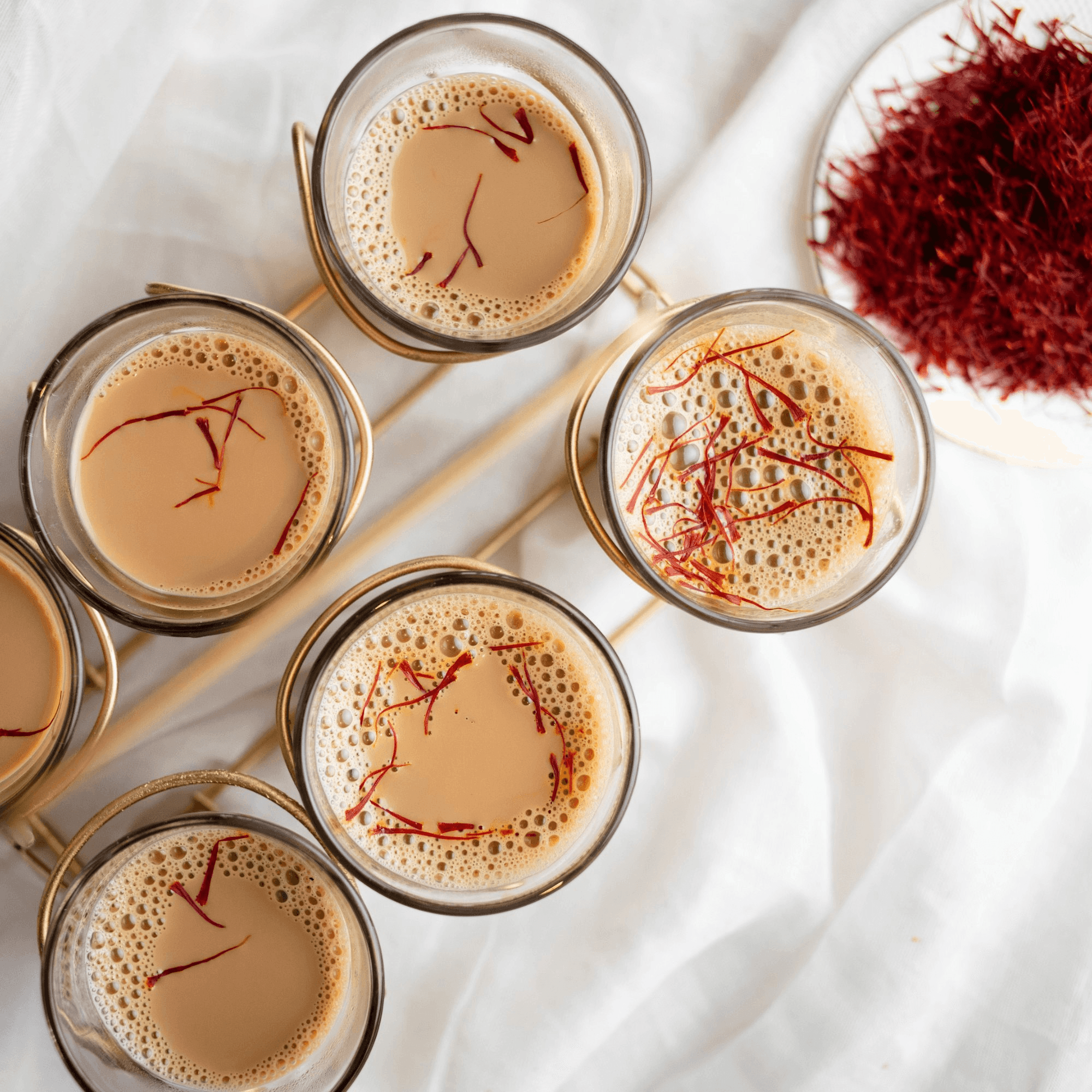A bold and aromatic brew of strong tea, delicately infused with the luxurious essence of saffron. This traditional cup offers warmth, comfort, and a touch of royal indulgence in every sip.